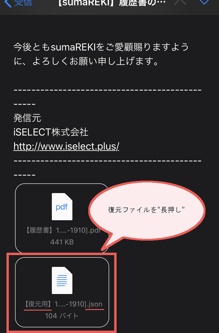 添付されている2つのファイルのうち「.json」となっているファイルを長押しして操作メニューを表示します。