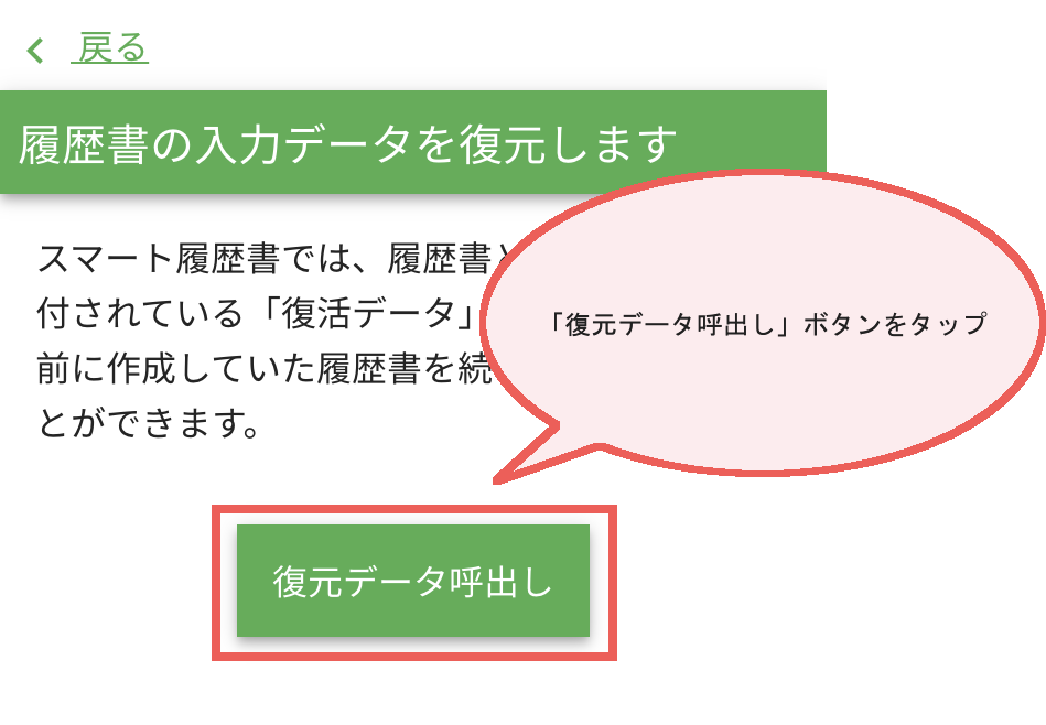 スマレキTOP画面にて、データを復元したい履歴書用紙の「データ復元」ボタンをタップします。
